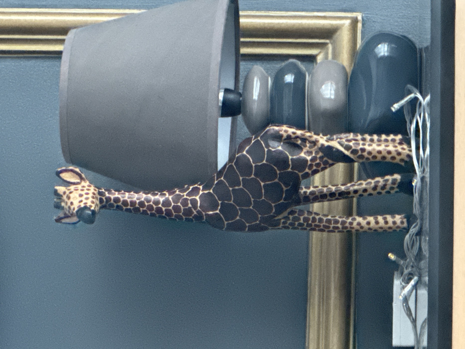 The image displays an indoor scene, specified to be located in Budva, Montenegro. The primary subjects are a carved wooden giraffe figurine and a table lamp, arranged on a dark, glossy surface. The giraffe, positioned left of center, is patterned with dark brown polygonal patches outlined in light tan, standing upright with a long neck and four legs. Its head features small ossicones and a dark snout. To the right of the giraffe, a table lamp stands with a conical grey fabric lampshade. The lamp's base comprises three stacked, smooth, oval-shaped elements, progressively darker from top to bottom, resting on a flat, dark base. The background consists of a dark blue-grey wall. A golden-colored rectangular frame is partially visible on the wall behind the lamp and the lower portion of the giraffe. A string of small, clear LED-style lights is arranged on the dark surface in the foreground, in front of both the giraffe and the lamp base. No individuals are present, and the objects are stationary.
