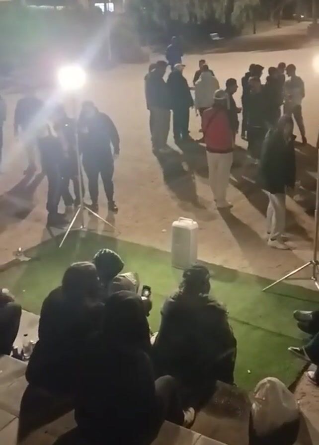 group of people gathered in an outdoor space at night. The area is lit by a standing light. Some people are standing and interacting in the center, while others are seated on steps, some looking at their phones. The ground is a mix of dirt and artificial turf. A white container is also visible. The scene appears to be a casual gathering, possibly a filming session or a relaxed social event.
