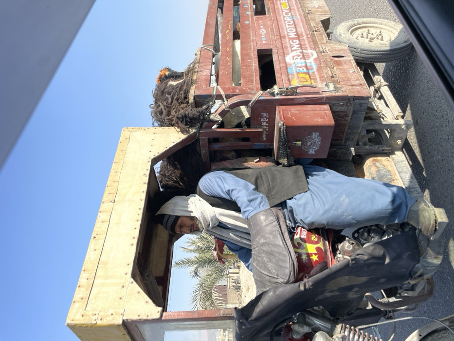 The image depicts a male individual operating a red, modified motorized rickshaw (motocart) on a paved road under a clear blue sky in Arghandab, Afghanistan. The man, with a beard, wears a black knitted beanie, a light-colored headscarf wrapped around his head and neck, a light blue shalwar kameez, and a dark vest. His hands, covered by black padded handlebar mitts, are on the vehicle's controls. His left foot rests on a metallic footrest. The vehicle's front section features a red motorcycle base with a yellow star and Farsi/Dari script, topped by a makeshift yellow-painted wooden canopy supported by a metal frame. The rear portion is a red, open-top cargo bed constructed from metal bars, showing signs of wear and rust. "BIRANG MOTORCYCLE" is visible in English on the side of the cargo bed, along with Farsi/Dari script. A red metal box, secured with a padlock, is attached to the side of the cargo bed. The cargo bed is filled with multiple livestock animals, identifiable as sheep or goats. Several dark-fleeced animals with shaggy wool are prominent, one with an orange marking on its head visible near the front of the cargo area. Lighter-colored animals are also present further back. In the background, under the bright daylight, are palm trees, low-lying structures, and a distant, hazy mountainous or hilly landscape, indicative of a rural or semi-urban environment. The vehicle appears to be in motion, as observed from an adjacent moving perspective.