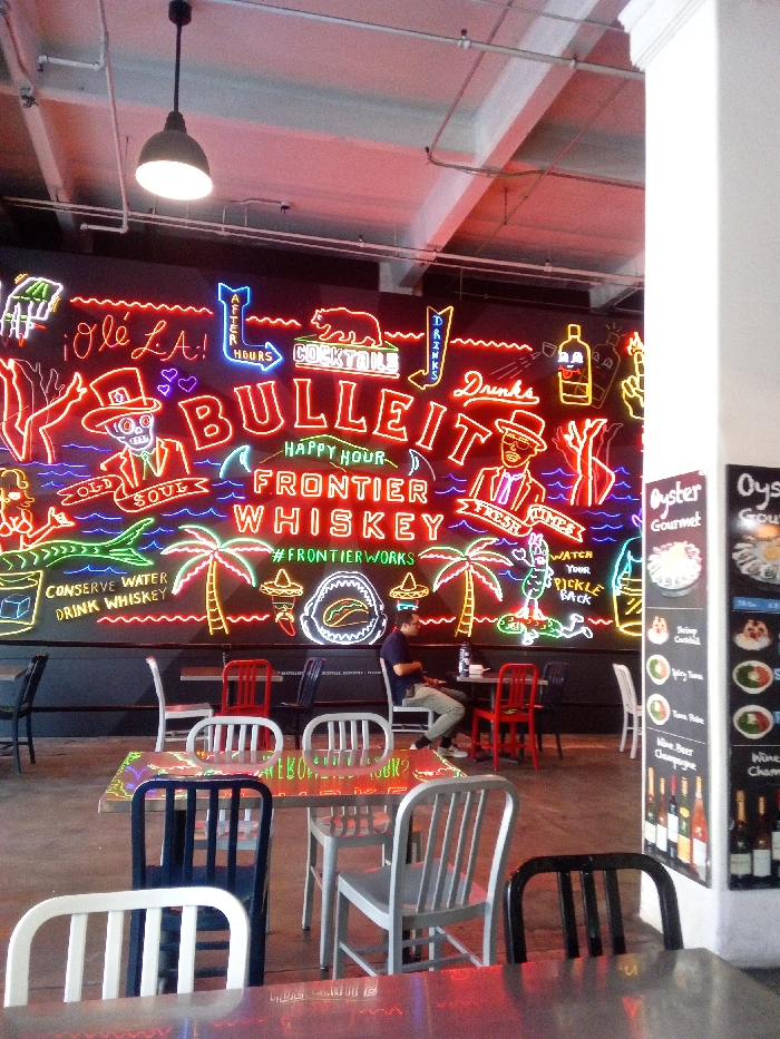 The image displays the interior of a restaurant or bar area within Grand Central Market, located in Downtown Los Angeles, California, United States. The scene is dominated by a large, multi-colored neon sign on a dark wall, which illuminates the space. The sign features numerous phrases and icons, including "BULLEIT HAPPY HOUR FRONTIER WHISKEY #FRONTIERWORKS," "Olé LA!," "AFTER HOURS," "COCKTAILS" (with a bear icon), "DRINKS" (with a bottle icon), "OLD SOUL" (with a skeleton figure in a top hat), "FRESH TIMES" (with a man in a fedora), "CONSERVE WATER DRINK WHISKEY" (with a mermaid), and "WATCH YOUR PICKLE BACK" (with a pickle figure), alongside decorative elements like palm trees and a shark's mouth containing a taco. Numerous tables and chairs are arranged in the foreground and midground. The chairs are of an industrial design, appearing in red, white, black, and silver/grey. One rectangular table in the immediate foreground exhibits a reflective, colorful surface. A single male individual is seated at a table on the right side of the frame, facing away from the viewer. He is wearing a dark short-sleeved shirt and light-colored pants, and appears to be looking down at an object on the table, possibly a phone or menu. To the far right, a white architectural pillar displays two vertical menu boards. The visible portions advertise "Oyster Gourmet" with images of oysters and other seafood dishes, as well as listings for wine, beer, and champagne, accompanied by photographs of bottled beverages. The ceiling features exposed white piping and a single black pendant light fixture. The floor is dark and unadorned.
