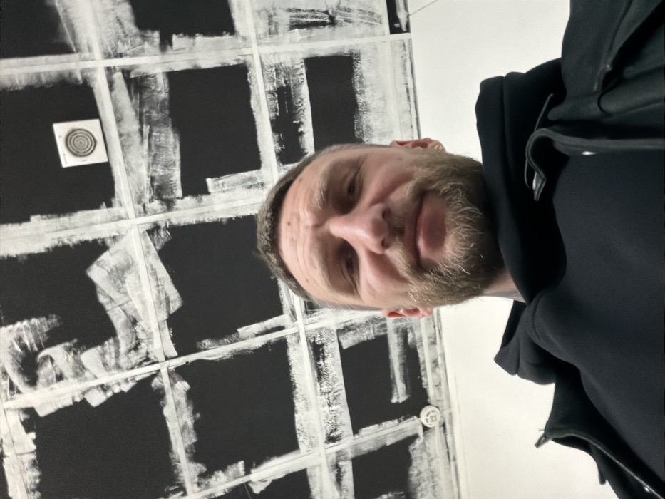 A male individual, approximately 30-45 years of age, is depicted in a low-angle, head-and-shoulders portrait. He has a light-colored beard and short hair. A small, light-colored stud earring is visible in his left ear. He wears a dark hooded sweatshirt beneath a dark jacket, with a tattoo partially visible on the left side of his neck, extending from under the sweatshirt. The subject is looking directly at the camera with a neutral to slightly smiling expression. The overhead background consists of an indoor ceiling, painted black, with an irregular white grid pattern applied through broad brushstrokes. Two circular white devices are mounted on this ceiling. One device, featuring concentric rings, is situated in the upper right portion of the frame. A second, simpler circular device is partially visible in the lower left, near the subject's head. These devices are consistent with building fixtures such as smoke detectors or air vents. The specific location within Rostov-on-Don, Russia, cannot be determined from the visual information present in this image.