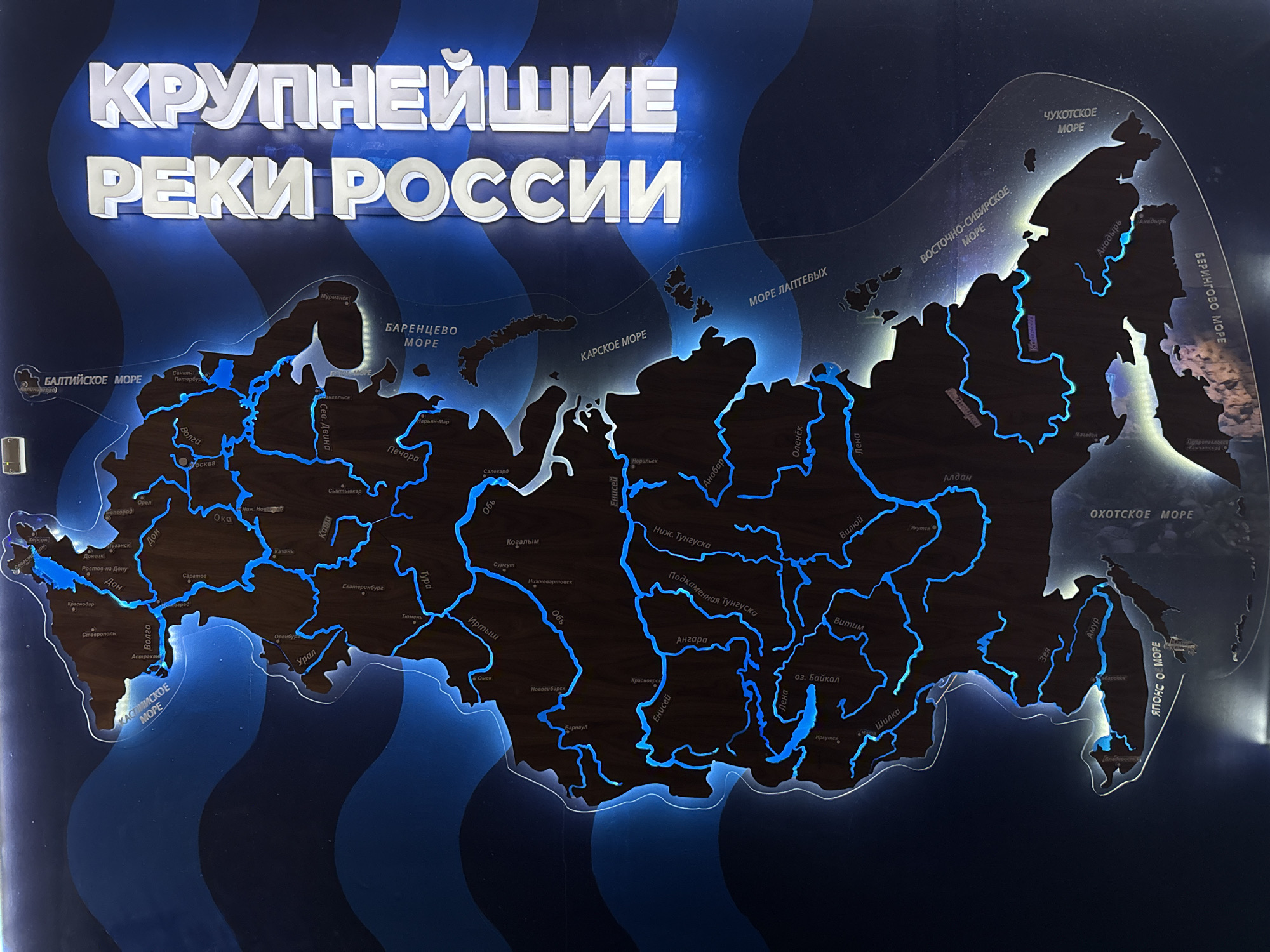 n illuminated map of Russia highlighting the major rivers. The map features the country's geographical outline with blue lines indicating the rivers, and city names are labeled in white. Surrounding seas, such as the Baltic Sea, Barents Sea, Kara Sea, Laptev Sea, East Siberian Sea, Chukchi Sea, Bering Sea, Okhotsk Sea, and the Sea of Japan, are also marked. The title at the top reads "КРУПНЕЙШИЕ РЕКИ РОССИИ" ("Largest Rivers of Russia" in English) in white, 3D lettering. Although city names are visible, there is no specific indication that this is located in Kogalym, Russia.