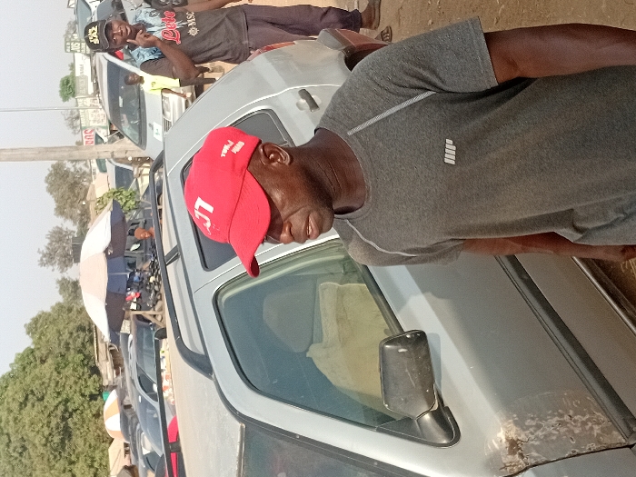 A man in a gray shirt and red cap stands next to a light-colored van. Other vehicles and pedestrians are visible in the background. The location appears to be an outdoor parking area or roadside. A man in a dark shirt and cap poses near another vehicle further in the background.