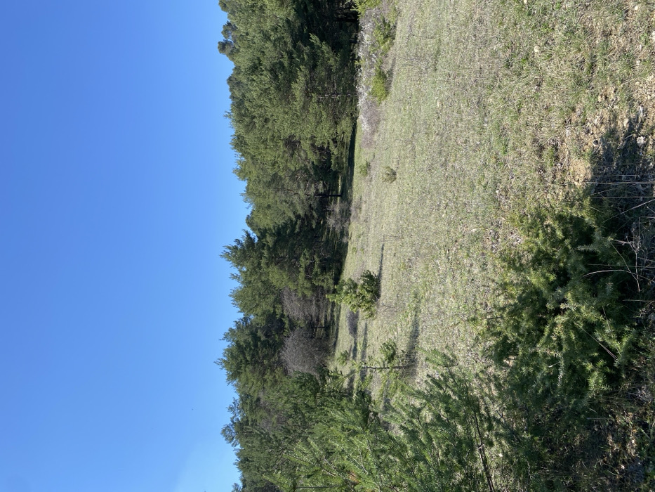 The image displays a natural landscape in Céreste-en-Luberon, France, under a clear, cloudless blue sky. The foreground and midground consist of a gently sloping terrain covered in sparse, dry light green and brown grass with visible patches of soil. Scattered across this area are numerous small, young evergreen plants, likely pine or fir saplings, varying in height and density. A denser, low-lying green bush occupies the immediate bottom-left foreground. The background is dominated by a dense forest line composed primarily of mature evergreen trees with dark green needles. Interspersed within the forest, particularly towards the center-left and mid-right, are a few deciduous trees with bare branches or minimal foliage. A cluster of white blossoms is discernible on a bush within the forest line on the right side. No human subjects, animals, or man-made objects are present. The scene is illuminated by direct sunlight, casting subtle shadows.