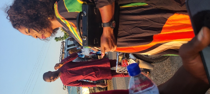 Two people stand outside on a sunny day. A woman with dark, curly hair wears a colorful dress and carries a black handbag. Beside her, a man in a maroon shirt stands in front of a parked vehicle. A water bottle rests on a nearby surface. A hand holding a phone is in the bottom right corner of the frame. The image is rotated clockwise.