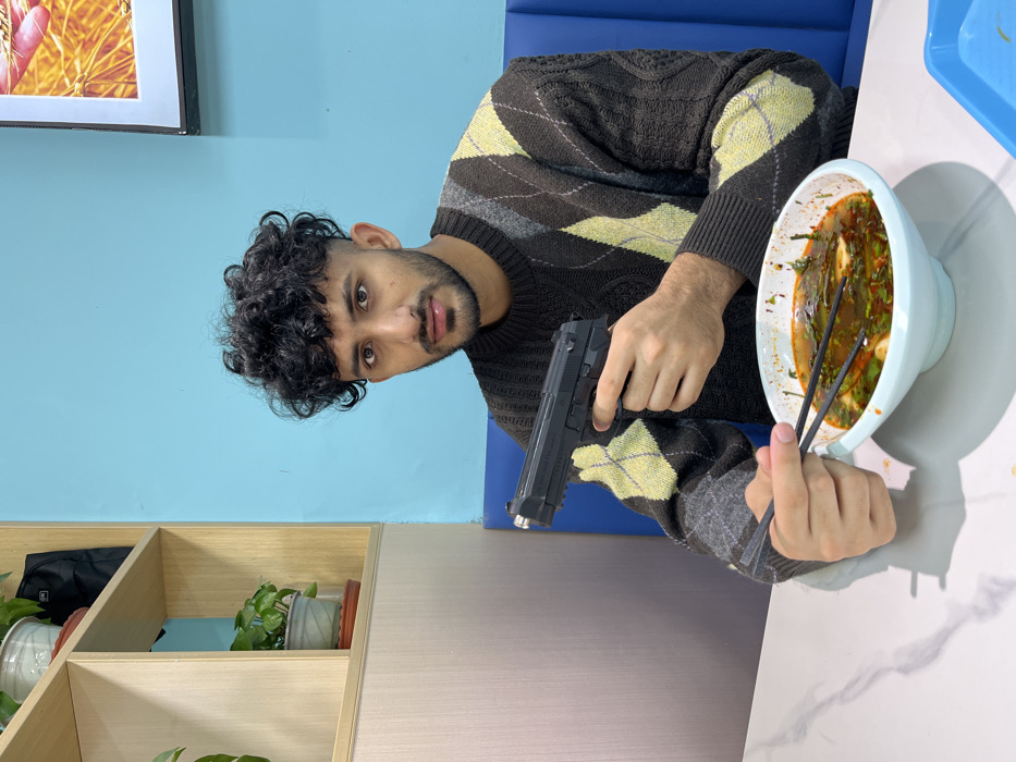 - "A man with curly hair holds a black gun in his right hand while holding chopsticks in his left hand next to a bowl of soup" by FM-Q6Q9j2, licensed under CC BY 4.0