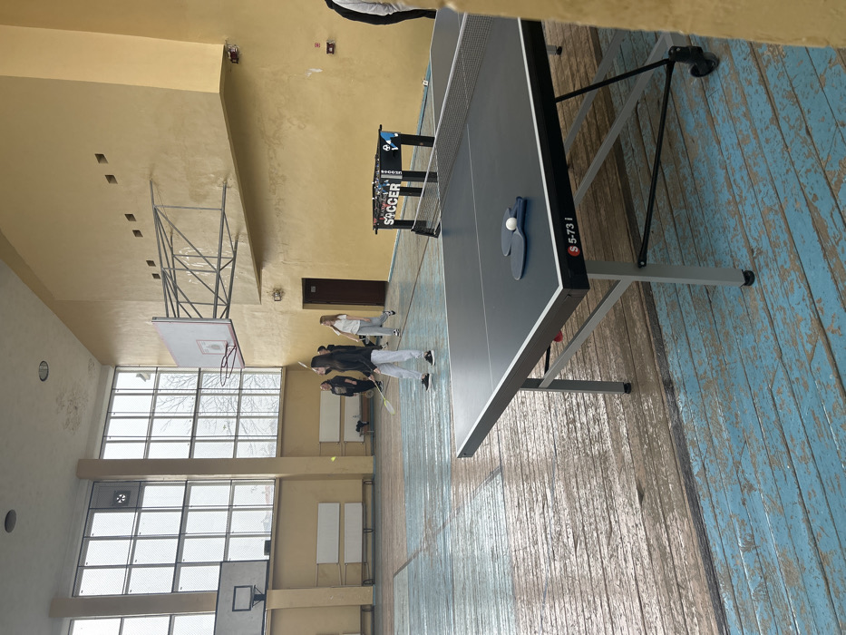 This image depicts an indoor gymnasium located in the city of Kardzhali, Bulgaria. The scene captures multiple activities and subjects within a utilitarian sports facility. In the immediate foreground, a dark blue table tennis table, model "S 5-73 i", is positioned centrally, viewed from an oblique angle. Two dark blue table tennis paddles and a single white ball rest on the table's surface. The floor beneath and extending throughout the gymnasium is composed of worn wooden planks, exhibiting significant chipping and fading of a light blue paint, revealing the natural wood underneath. In the midground, several individuals are present. A person in a black long-sleeved shirt and light grey athletic pants holds a badminton racket, positioned as if mid-stroke, with a yellow shuttlecock suspended slightly above the racket. To their left, another person in a black hooded sweatshirt observes the activity. Further to the right, two additional individuals are in motion; one, dressed in white, walks or jogs away from the camera, while another is partially visible to the far right. A black foosball table, labeled "SOCCER", is situated against the right-hand wall, beyond the table tennis table. The background features large, multi-paned windows spanning the far wall, allowing significant natural light into the space. Bare tree branches are discernible outside the windows. The walls of the gymnasium are painted a muted yellow, showing signs of wear, including scuffs and discoloration. Two basketball backboards with hoops are mounted on the walls; one is partially visible on the far left, and another, with a metal support structure, is visible on the right wall. A dark door is present in the center background. The ceiling is high, with visible structural elements and signs of age or maintenance requirements, including discoloration.
