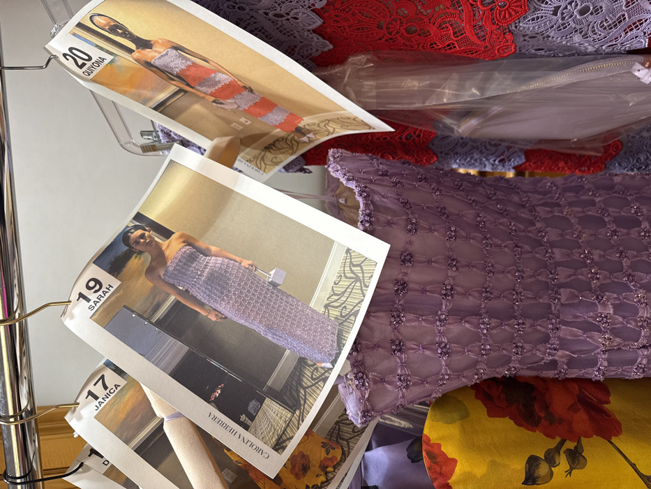 This image captures a garment rack laden with luxury apparel and associated identifying printouts in an indoor setting, likely a high-end dressing area or showroom in Palm Beach, United States of America