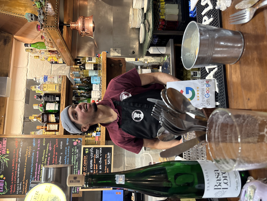 A man stands behind a bar filled with bottles of alcohol and a menu board listing food items. A metal bucket, cutlery, an empty glass, and a bottle of wine labeled "Basa Lore" are on the bar's surface. A Google "Review us on Google" card is present. Menu items include "REVIOUS DE BACALADA LA BRASS CON YENA," "HUEVO A BRON TEMPERATURA," and "DE MORRO Y SEPIA," with prices listed. The overall impression is of a bustling restaurant or bar setting.