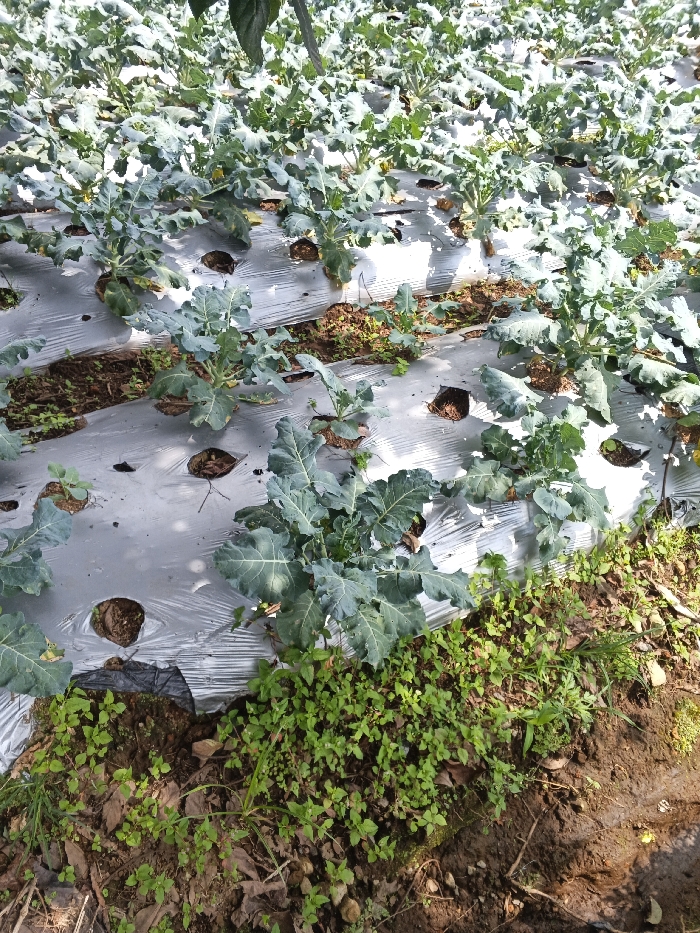 A field of broccoli plants grows in rows covered by a silver plastic sheet with holes for each plant. The broccoli plants have broad, leafy greens. Weeds and other small green plants thrive in the spaces between the plastic sheets. The soil is visible on the edges of the plastic, appearing dark and slightly moist.