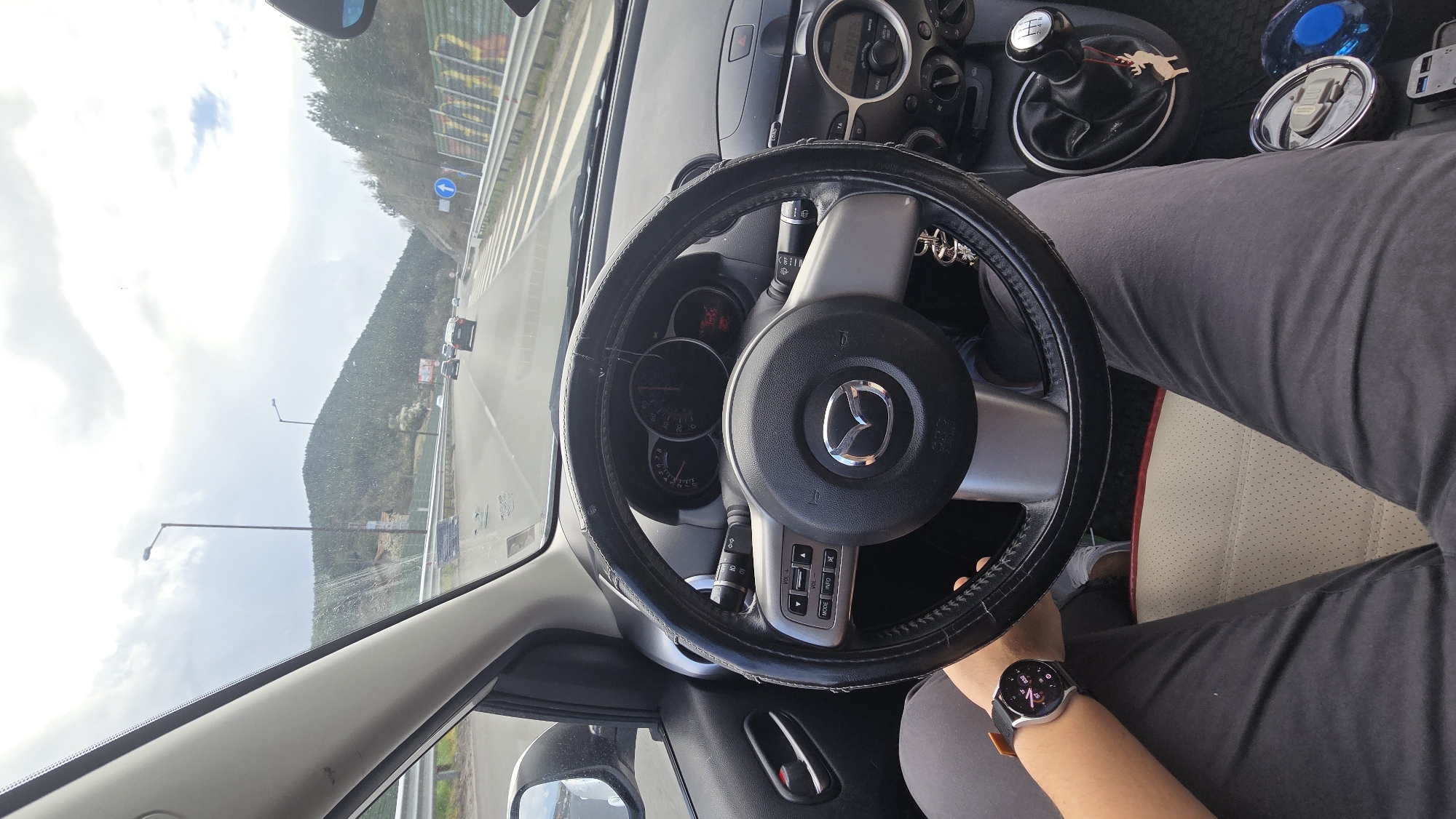 A person sits in the driver's seat of a Mazda car, driving on a highway near Studena, Bulgaria. The steering wheel is black and silver with a Mazda logo in the center. The car is in motion, as evidenced by the blurred scenery visible through the windshield, which includes a hillside, road signs, and other vehicles. The person is wearing dark grey pants and a smartwatch on their left wrist. The car's dashboard and gear shift are visible, suggesting a manual transmission. The seat is light beige with red piping.
