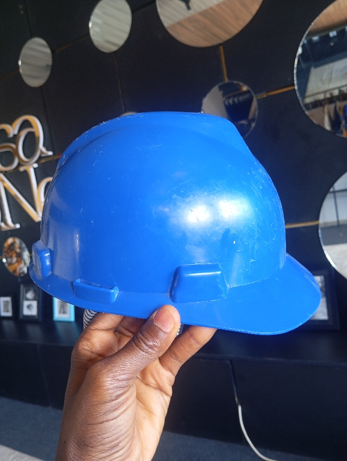 A dark-skinned right hand grips a blue plastic hard hat by its brim, held against an indoor background. The hard hat exhibits multiple scuffs and scratches, indicative of prior use, and features several molded plastic protrusions along its lower edge. The background consists of a dark-colored wall decorated with an arrangement of circular mirrors of various sizes, some linked by thin metallic rods, reflecting indistinct interior elements. Partially visible white three-dimensional lettering, "sa N," appears on the wall to the upper left. Below this, a dark, flat surface, possibly a counter, displays several small, framed items. A white electrical cable extends downward from this surface on the right side. The environment suggests an interior commercial or office space. The precise location within Jos, Nigeria, cannot be determined from the visual evidence.