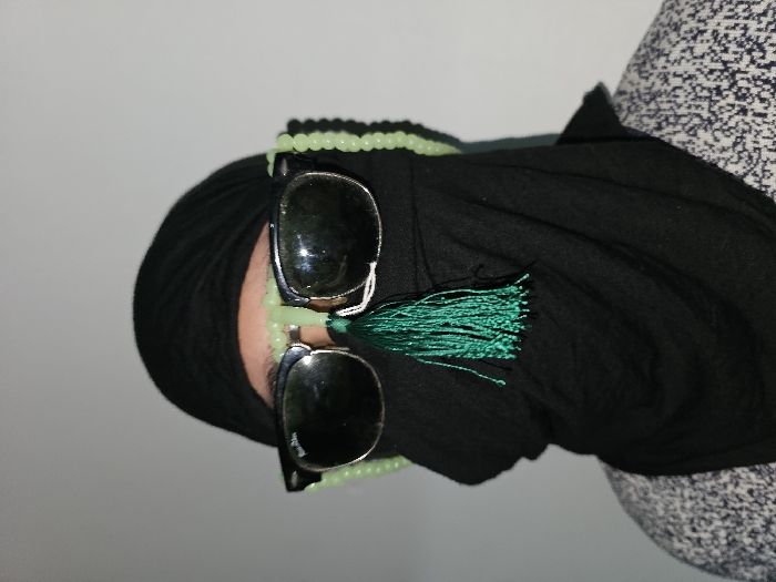 A person wearing a black headscarf and sunglasses is shown. The sunglasses have a green beaded chain and a green tassel attached to the side. The person is wearing a gray patterned shirt or jacket. The background is a plain gray wall.