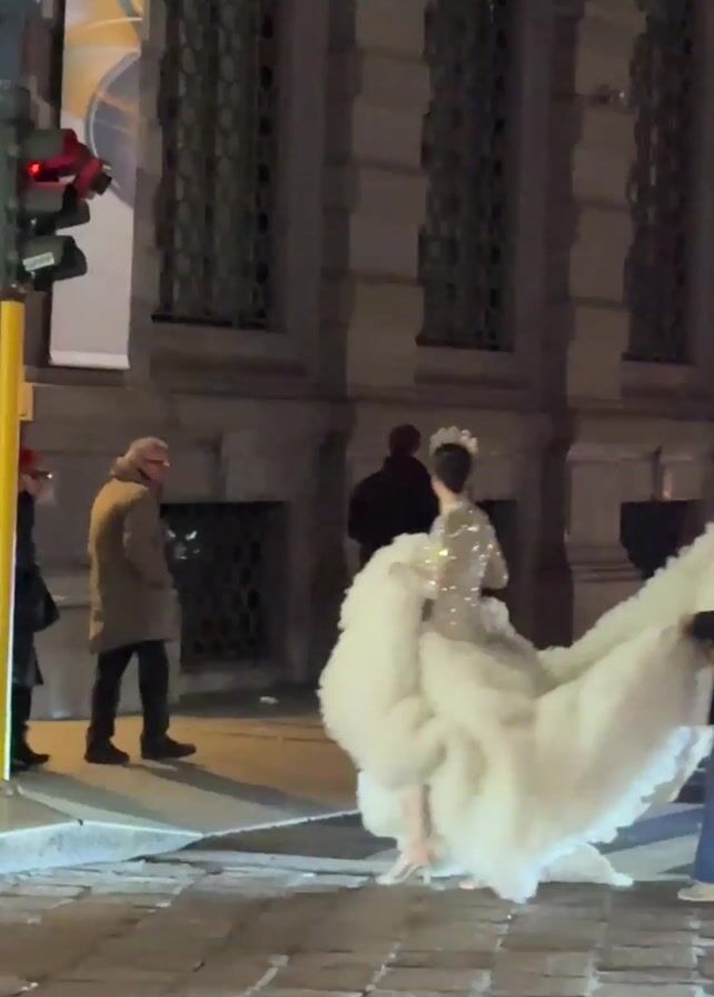 A woman wearing a sparkly dress and a large, white, fluffy gown walks across a crosswalk at night. The street is paved with cobblestones and there are people standing on the sidewalk watching her. Two people are holding the train of the gown. A bicycle is parked on the sidewalk. A car is driving on the street. Streetlights illuminate the scene. The buildings in the background are ornate and look historic.