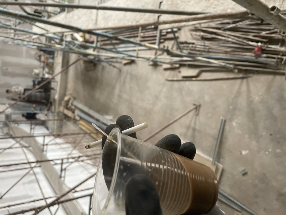 The image depicts an interior construction site in Gavril Genovo, Bulgaria. In the foreground, a black-gloved hand holds a clear plastic cup containing a brown liquid, possibly coffee, filling approximately one-third of the cup. A lit cigarette, showing an ember and a wisp of smoke, is positioned within the cup opening alongside an unlit cigarette and a clear plastic stirring stick. The perspective is from an elevated position, looking down into the work area. The environment consists of extensive metal scaffolding structures, both upright and stacked on the unfinished concrete floor. In the blurred background, two individuals are visible: one on the left in dark clothing, appearing to be working or bending, and another on the right in light clothing, standing upright. Various construction materials, including metal profiles and wood debris, are scattered across the concrete floor. The walls in the background appear to be unfinished or recently plastered.