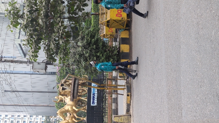 A street view features a golden chariot statue pulled by horses. A man in a turquoise jacket and dark pants walks along the sidewalk near the statue, carrying an object over his shoulder. Another person, similarly dressed, walks on the street in the background. A yellow and black barricade is visible along the sidewalk. Buildings and trees line the background on the left side of the frame.