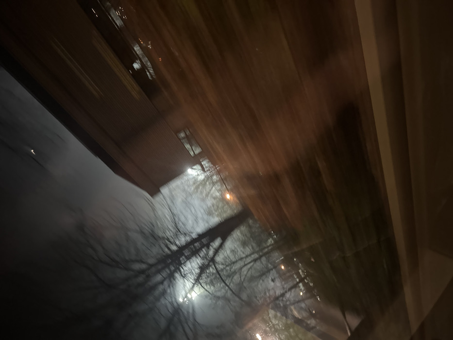 An abstract view appears to be from inside a building, looking out through a window. Silhouetted trees with bare branches reach toward a dimly lit sky. A building with visible windows is partially visible. The image has a blurred, distorted quality, possibly due to motion or focus issues. The overall scene evokes a sense of night, winter, and an indoor-outdoor contrast.