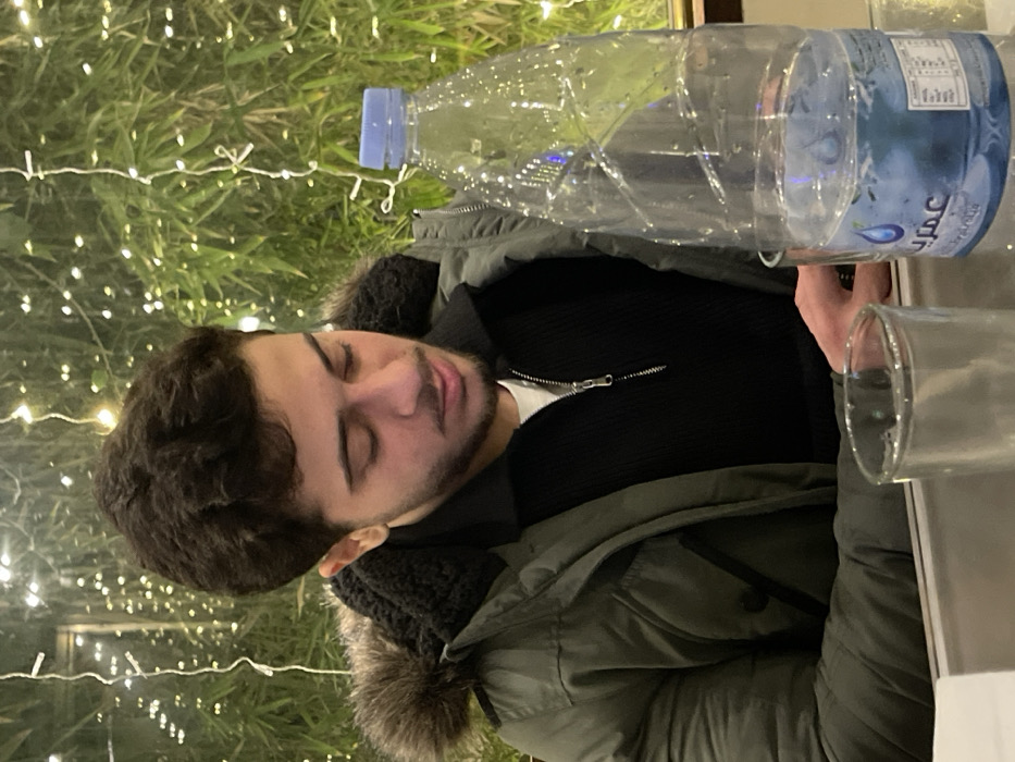 A man with dark, curly hair and a beard is resting, his eyes closed. He wears a dark sweater under a green coat with a furry collar. A large, partially empty water bottle is situated above him on the table. A clear drinking glass also sits on the table's edge. A blurred background features greenery and small, white lights. The orientation of the image is portrait, with the objects arranged in a vertical composition.