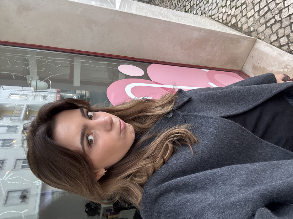 The image depicts a young adult female posing for a photograph on a cobbled street in Torres Vedras, Portugal. The individual has medium-brown, layered hair and is wearing a dark grey, collared wool coat over a black garment. Her facial expression shows pursed lips and slightly narrowed eyes. A small, star-shaped earring is visible in her left ear. She stands next to a retail storefront window, which displays large pink, abstract shapes with white outlines on its interior. The window's glass reflects a multi-story building with windows and balconies, white string lights, and a white dome security camera mounted within the reflection. The street is paved with grey, irregularly shaped cobblestones. A light-toned architectural column or facade element frames the right side of the storefront window.