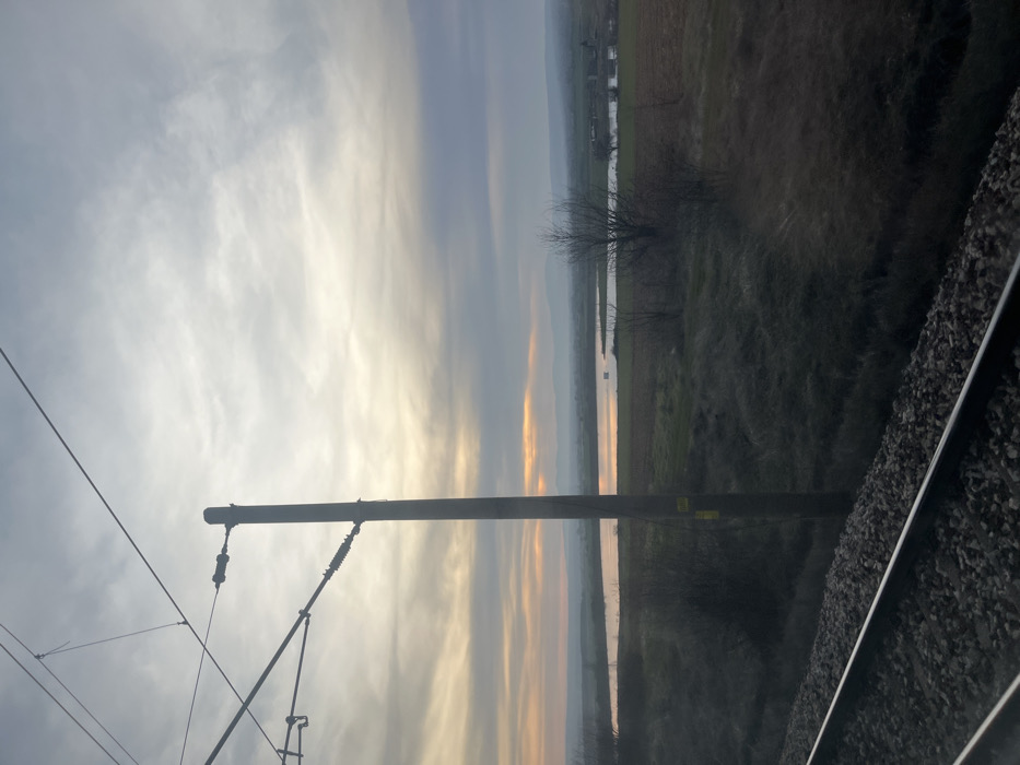 The image presents a landscape view captured from a moving train in Lozarevo, Bulgaria, at twilight. In the immediate foreground, railroad tracks composed of two steel rails on a bed of gravel ballast are visible on the lower left. A dark utility pole, characteristic of a railway catenary support, stands prominently in the mid-ground, extending vertically from the lower frame upwards, adorned with insulators and multiple overhead power lines that traverse the upper left quadrant of the frame. To the right of the pole and beyond the tracks, the terrain consists of fallow or sparsely vegetated fields, exhibiting shades of dark green and brown, with some patches of dry grass. Scattered bare deciduous trees and bushes are present within these fields. A significant body of water, likely a lake or reservoir, occupies the mid-ground, reflecting the muted hues of the sky, including a band of orange and yellow light along the distant horizon. Structures consistent with the outskirts of Lozarevo, Bulgaria, are visible on the far bank of the water body and extend into the distance. The background features a hazy horizon with faint hills or mountains. The sky is largely overcast with stratocumulus clouds, displaying a gradient from light grey-blue at the zenith to a subtle glow of orange and yellow light emanating from the low horizon, indicative of either sunrise or sunset. No individuals, animals, or active interactions are depicted.