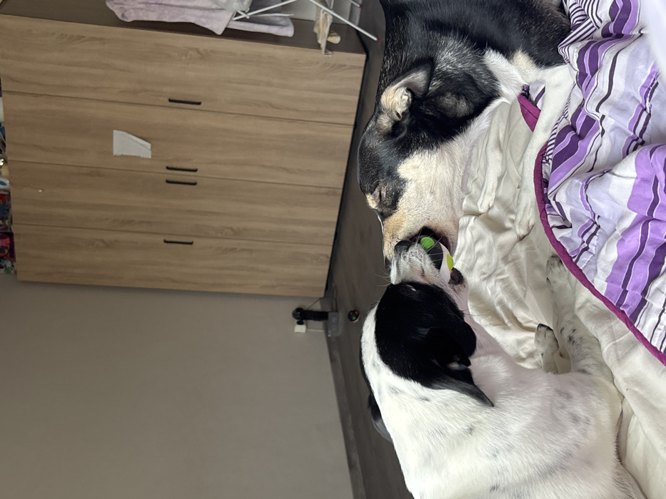 - "The image displays an indoor domestic setting, likely a bedroom, where two dogs are engaged in play" by FM-xI8gl2, licensed under CC BY 4.0