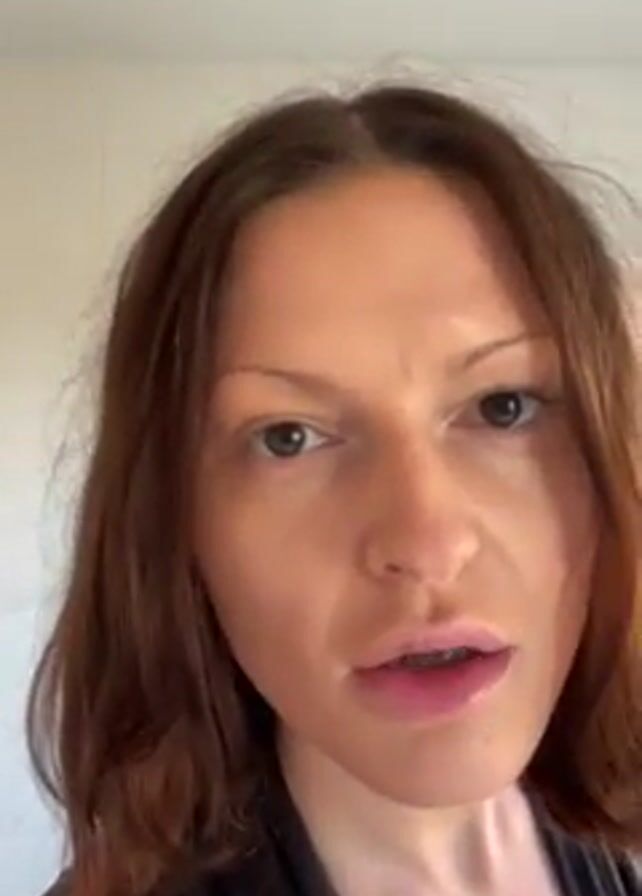 The video features a person with reddish-brown shoulder-length hair, standing indoors against a white tiled wall