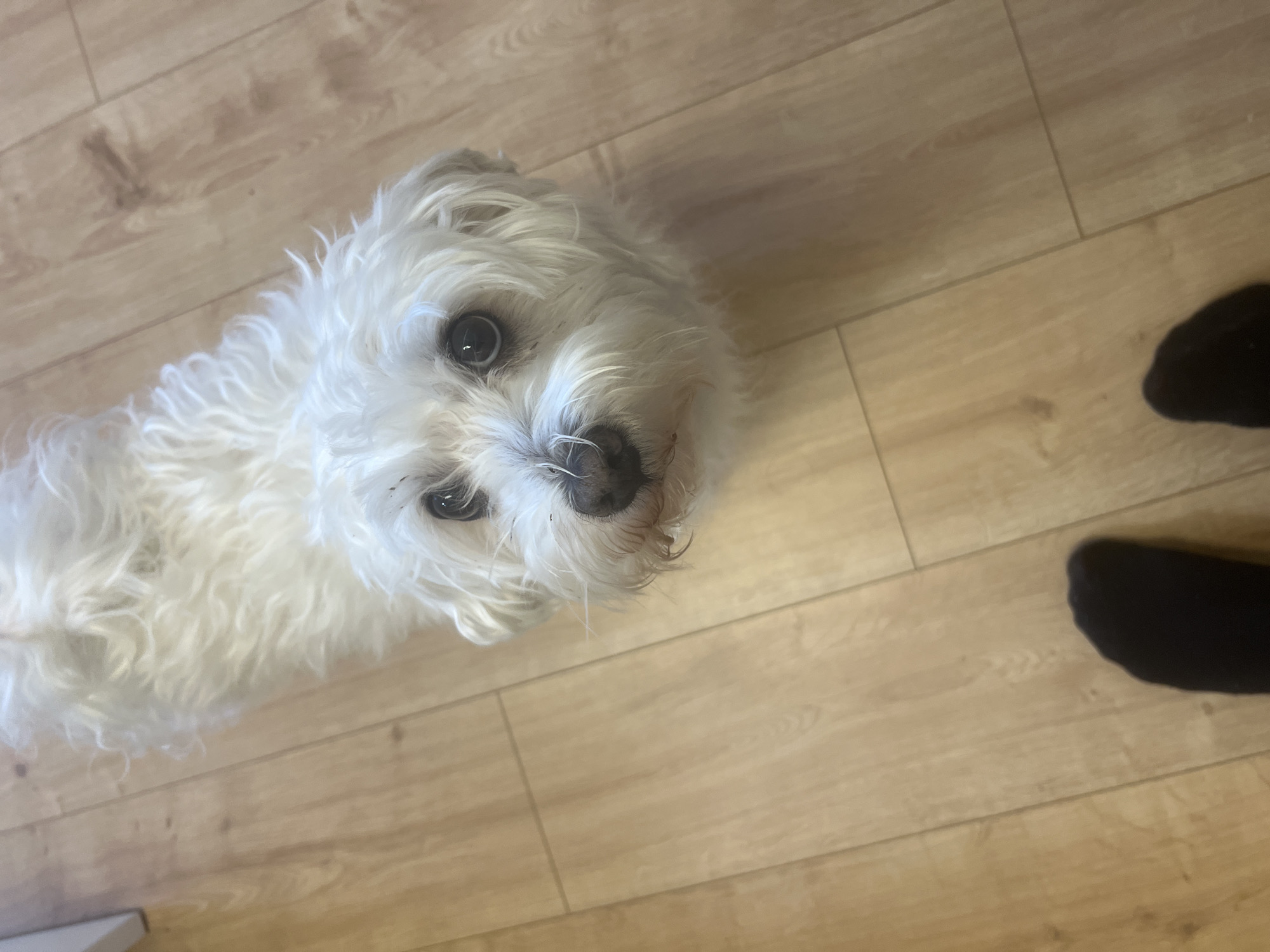 The image depicts an indoor scene located in Vienna, Austria. A small, white, curly-haired dog, consistent with a Maltese type, occupies the central and upper portions of the frame, positioned on a light-toned laminate wood-look floor. The dog features dark, round eyes and a black nose, with minor reddish discoloration visible around its muzzle area. Its head is tilted slightly upward, and its gaze is directed towards the camera. In the foreground, at the bottom of the frame, two human feet wearing black socks are partially visible, indicating a standing individual's perspective. A segment of a white object, possibly a piece of furniture or a baseboard, is present in the upper left corner of the frame.