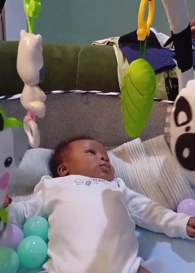 A baby lies on its back in a playpen with colorful balls. Hanging above the baby are various toys, including a white bear, a green leaf, and a panda. The baby, wearing a white onesie, looks up and opens its mouth. A person is standing to the side of the playpen, out of focus.