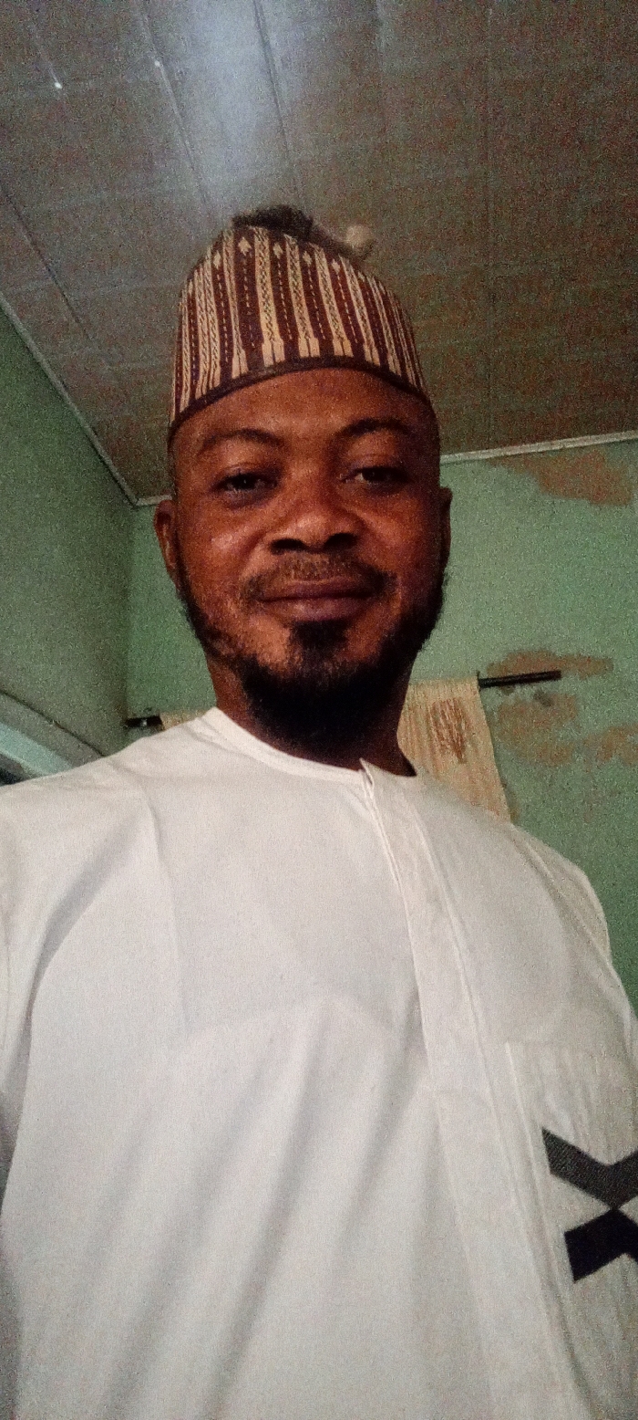 The image displays an adult male subject, dark-complexioned, positioned for a frontal, mid-shot portrait. He has a trimmed dark beard and mustache, dark eyes, and exhibits a smiling expression with a direct gaze toward the camera. He wears a patterned cap, predominantly brown with beige vertical stripes and geometric designs. His attire includes a white, long-sleeved garment, appearing to be a traditional tunic with a placket detail on the front. A dark, possibly black, "X"-shaped emblem is visible on the lower right quadrant of his garment. The background indicates an indoor setting featuring a light green/turquoise painted wall. This wall exhibits visible signs of wear, including discoloration and peeling paint, particularly on the right side. Above, a light-colored, textured ceiling is present. On the upper right section of the wall, a dark horizontal rod or bar is affixed, from which a light-colored, vertically hanging, possibly woven fabric item is suspended. The scene is located in Dan Maliki, Nigeria.
