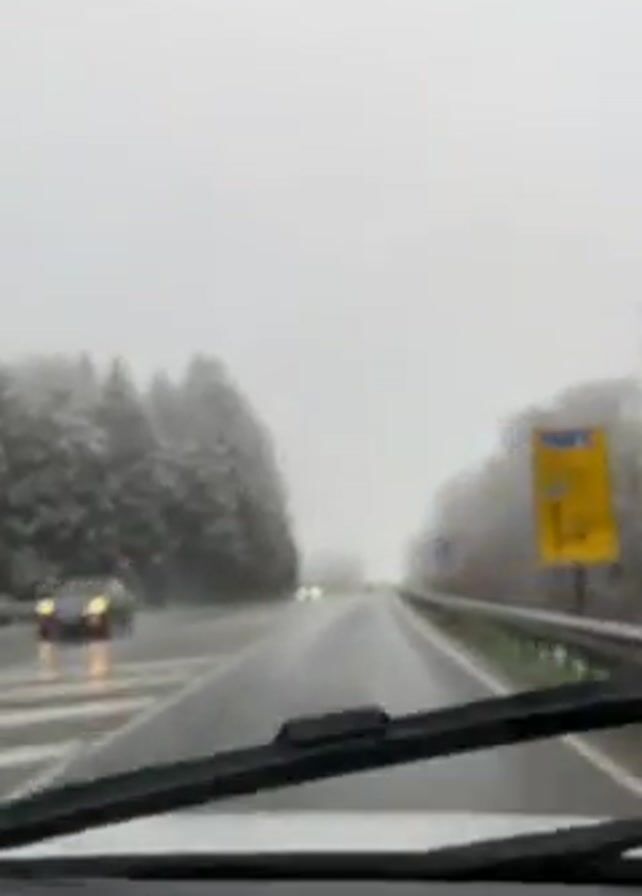 The view from inside a car shows a gray day with snow or sleet on the ground, trees and roadside objects