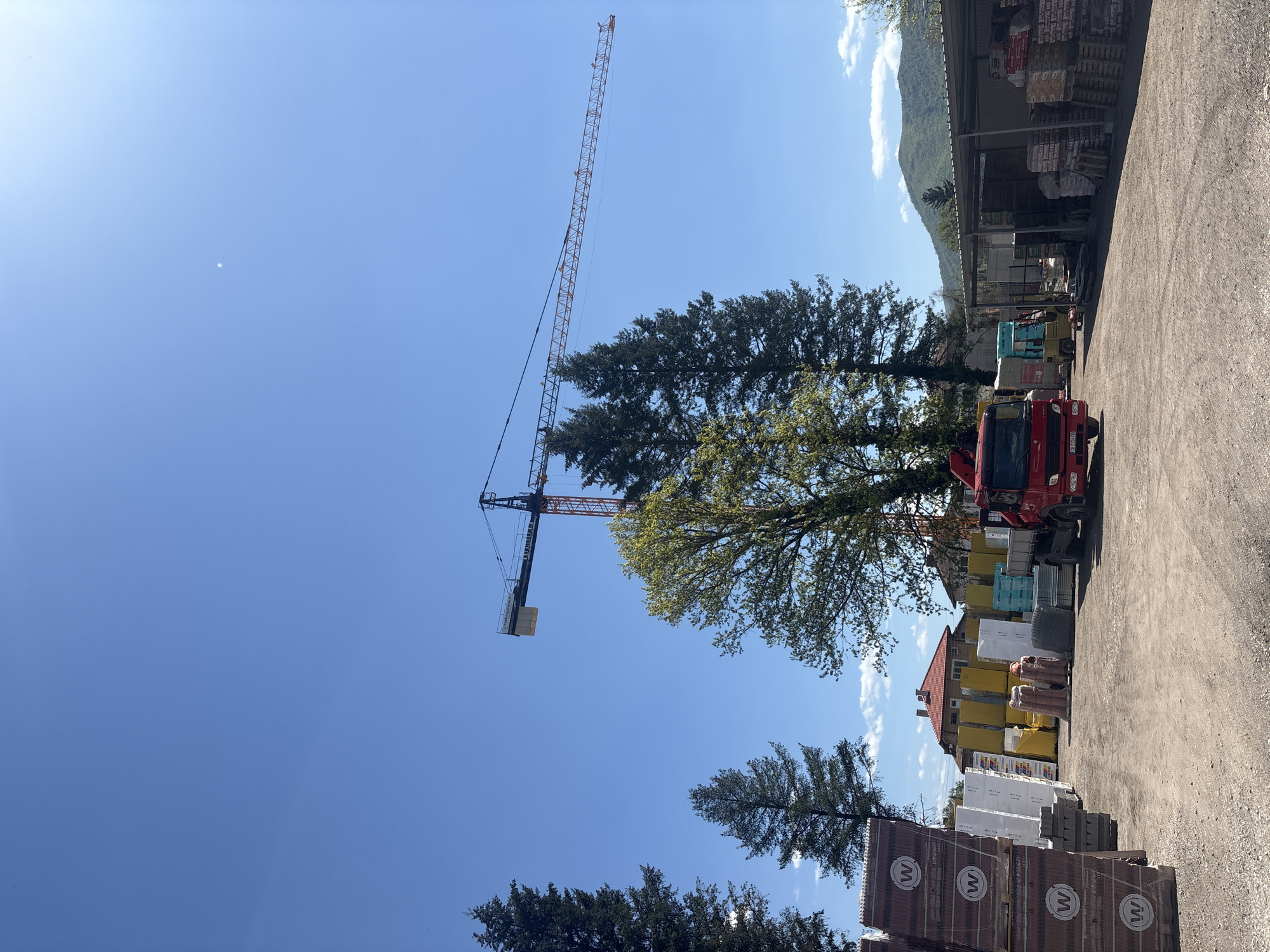 n outdoor scene with a mix of construction elements and natural features. A construction crane dominates the sky, rising above tall trees. A red truck is parked on the right side of the frame, near stacks of construction materials. The background includes buildings with red roofs and green mountains under a blue sky with scattered clouds. The image may be located in or near Botevgrad, Bulgaria, as this location was given in the prompt.