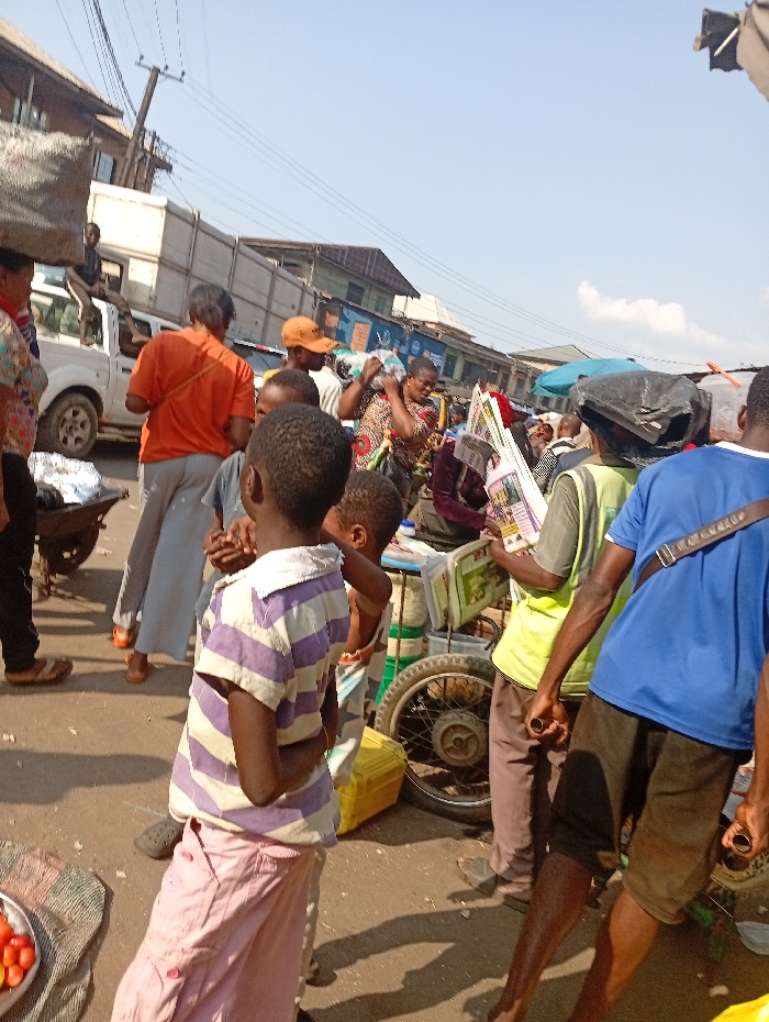 A bustling outdoor scene shows a crowd of people in a marketplace. A child in a striped shirt and pink pants stands prominently in the foreground. Further back, a woman wearing orange walks away. Someone is atop a white truck, carrying a large sack on their head. A newspaper vendor sits on a makeshift cart, surrounded by potential customers. The area appears to be a busy commercial hub with various activities taking place.