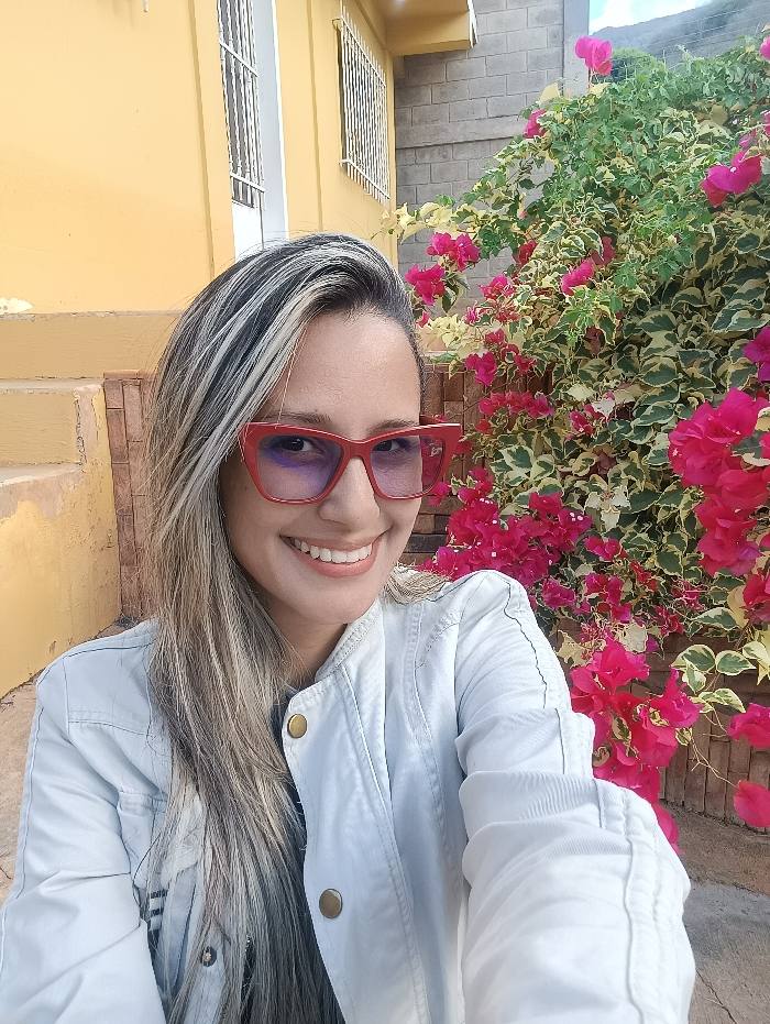 A fair-skinned woman with highlighted blonde hair smiles in a selfie. She wears red-framed glasses and a white bomber jacket with gold buttons. The background features a yellow building, a gray brick structure, and a vibrant bougainvillea bush with pink flowers. The scene appears to be outdoors, possibly a courtyard or garden area.
