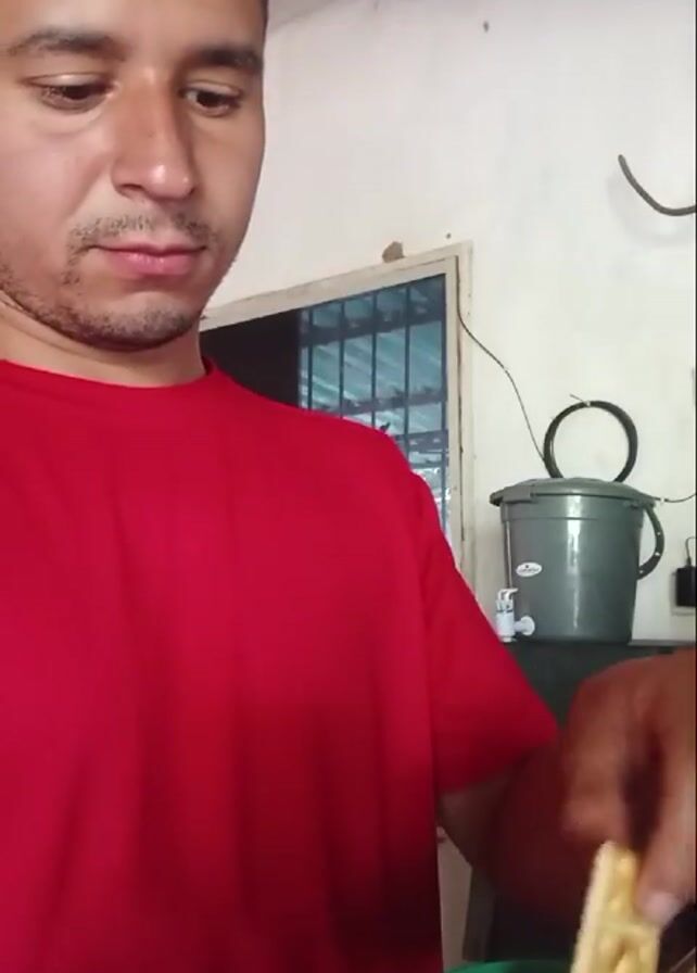 man in a red t-shirt eating a cracker. The man is fair-skinned, with short brown hair and a light stubble beard. He takes a bite of the cracker while looking at the camera, then continues to eat it. Behind him, there's a white wall, a window with bars, and a gray water dispenser on a black stool. Music plays in the background.