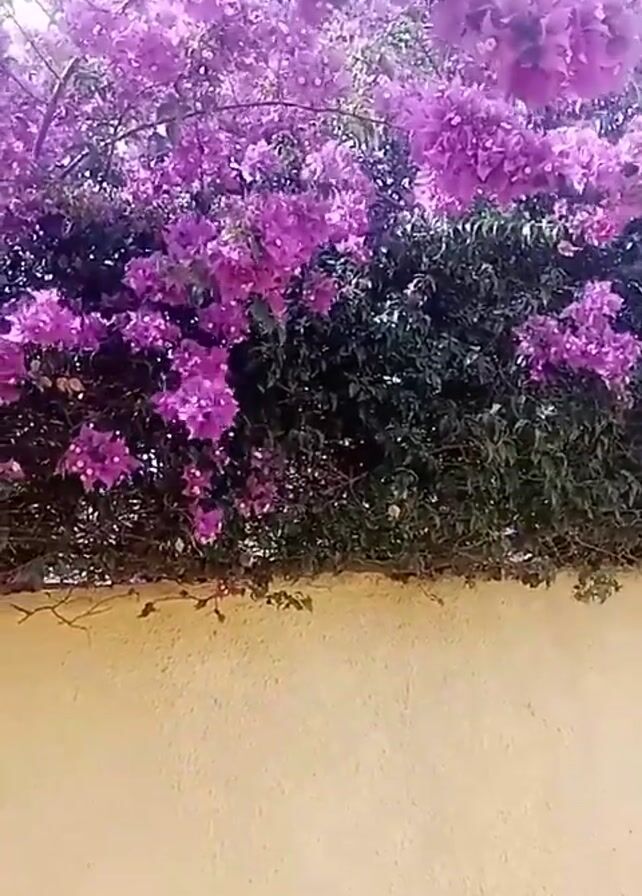 close-up view of a bush of bright pink bougainvillea flowers cascading over a beige wall. The wall takes up about half the frame, and the flowers and green foliage of the bush fill the upper half. The sun is shining brightly, making the colors vivid. There is the sound of music.