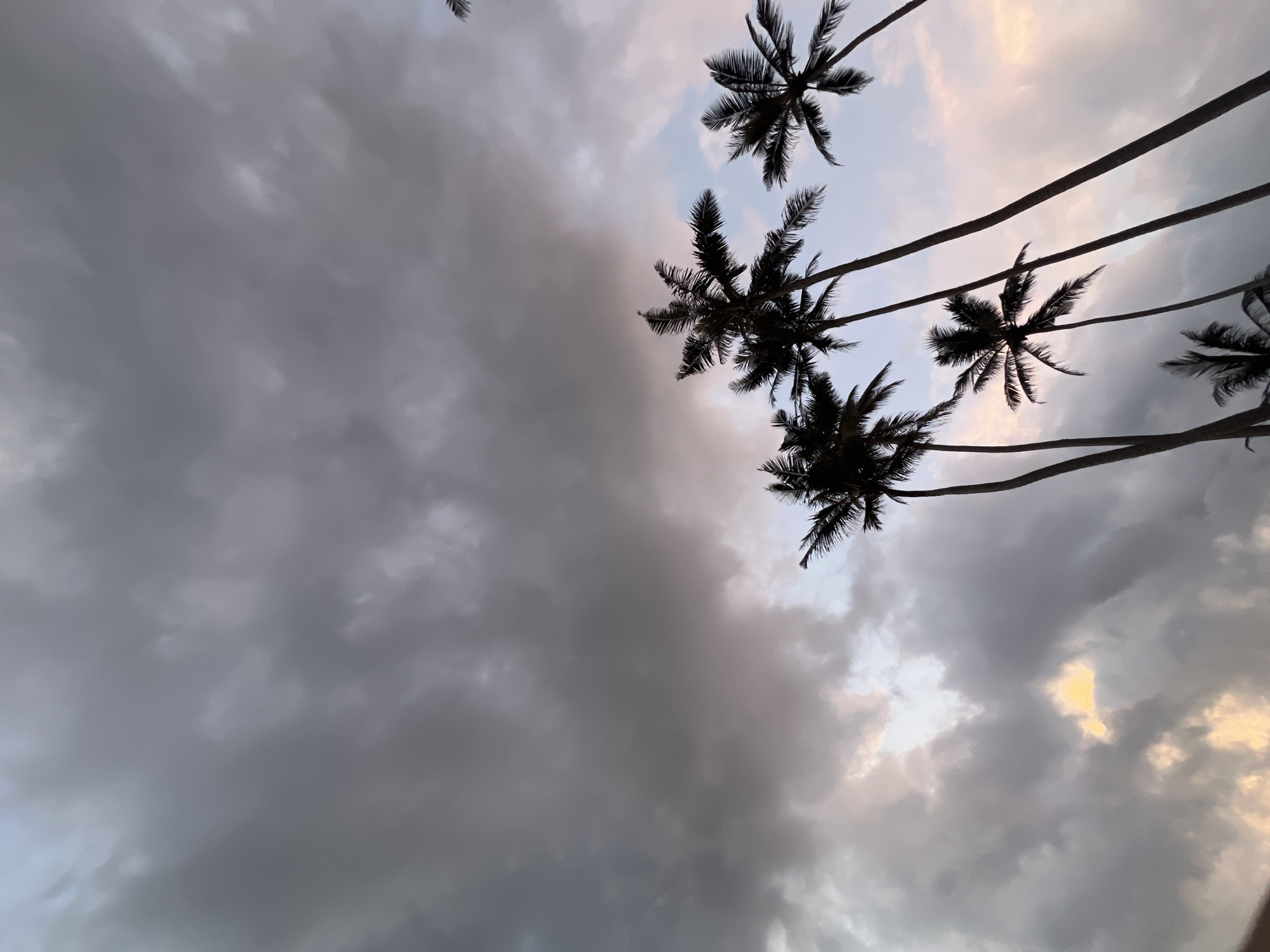 This image, captured in Kathaluwa, Sri Lanka, presents an outdoor scene dominated by an overcast sky and silhouetted coconut palm trees