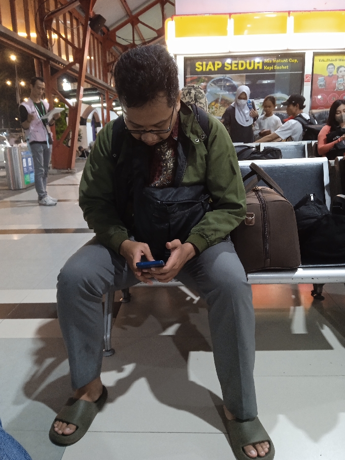 The scene is set in a waiting area, specifically identified as a platform or concourse within Stasiun Semarang Tawang, Semarang, Indonesia, characterized by its distinctive reddish-brown metal structural elements overhead and classic architectural details in the background. The environment is artificially lit, suggesting evening or nighttime. In the foreground, a male individual is seated on a light grey metal bench. He is wearing dark-rimmed glasses, an olive green jacket over a patterned brown and black shirt, grey trousers, and olive green slide sandals. A black utility pouch is strapped across his chest. He holds a blue smartphone with both hands, looking down intently at its screen. To his right, on the same bench, rests a dark brown duffel bag and a black backpack. In the mid-ground, to the left of the main subject, another male individual stands near a silver, cylindrical, multi-compartment waste bin. He wears a light pink or white vest over a light-colored top, grey trousers, and white sneakers, holding a flat, light-colored object, possibly a book or tablet, in his hands. Further in the background, a concession stand with a yellow sign displaying "SIAP SEDUH" (Ready to Brew) and text like "Mie Instant Cup, Kopi Sachet" (Instant Cup Noodles, Sachet Coffee) is visible. Several other individuals are present in this area, also seated on benches. One woman wears a white hijab and holds a small white item. Next to her, a person in a light top is visible. Further right, a person wearing a dark cap and a white t-shirt is seated, and to their right, a woman with dark hair in an orange long-sleeved top is also seated. The floor is light-colored with dark parallel stripes, and shadows are cast prominently across it by the artificial lighting.