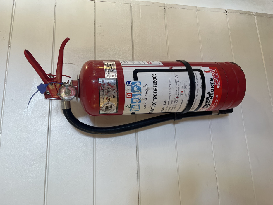 - "A red, cylindrical powder fire extinguisher is mounted vertically on a white, horizontally paneled wall" by FM-hfpyn2, licensed under CC BY 4.0