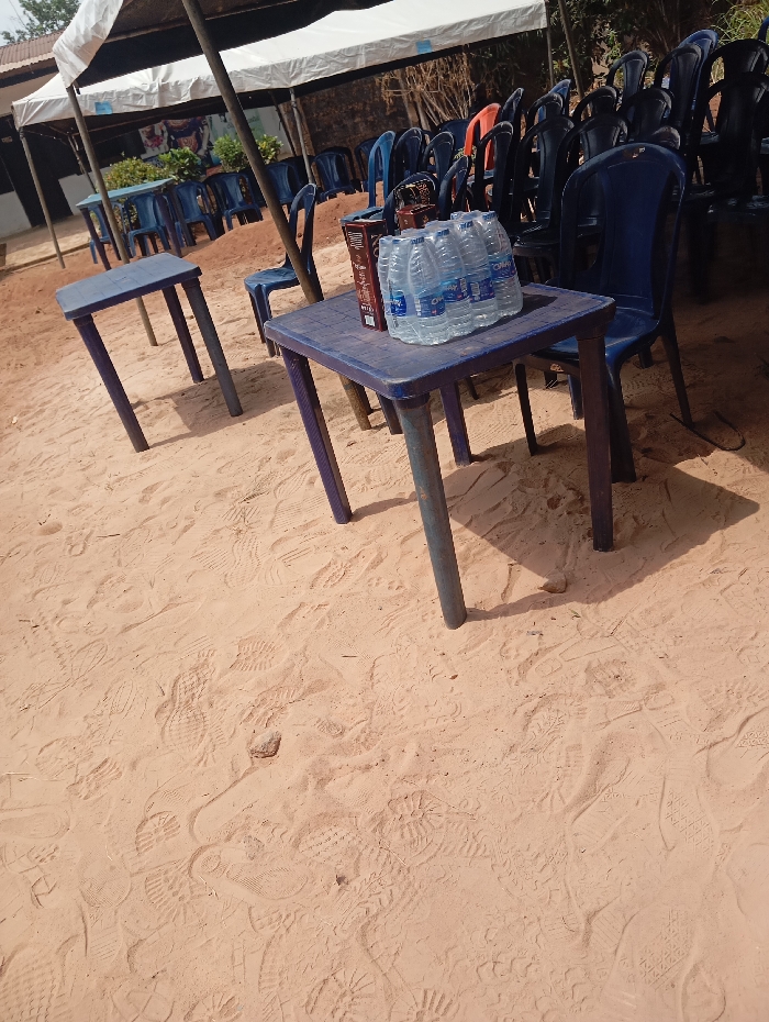 The scene depicts an outdoor gathering area located in Okpatu-Ukehe, Nigeria. The ground consists of light brown sand, visibly covered with numerous shoe and sandal footprints, indicating prior foot traffic. Overhead, a large white canopy tent is erected, supported by dark poles. Underneath and around the tent, numerous dark blue plastic chairs are arranged; some are individually placed, while others are stacked. Several small, rectangular dark blue plastic tables are present. In the foreground, one such table holds a six-pack of bottled water, branded "Okowa," alongside a brown rectangular item, possibly a carton or package. Another similar table is visible further back to the left. A dark building structure is partially visible behind the tent in the background. The area appears set up for an event or gathering. No individuals are visible in the image.