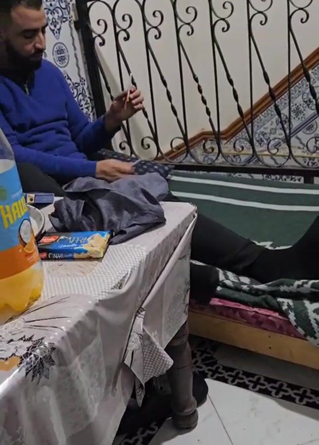 A man with a beard and a blue sweater sits on a bench in front of a staircase with black railings. He is holding a cigarette and a lighter, preparing to light the cigarette. A small table next to the bench holds a bottle of juice, a box of cookies, and a gray garment. The floor is tiled in a black and white pattern, and the wall behind the staircase has blue and white decorative tiles.