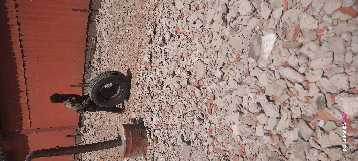 A side-angle shot captures an outdoor scene featuring an individual beside a red metal structure with a tire. The ground is covered in rubble, consisting of various-sized stones and bits of brick. A large, cylindrical object rests on the ground as well. The overall tone suggests a construction or demolition site.