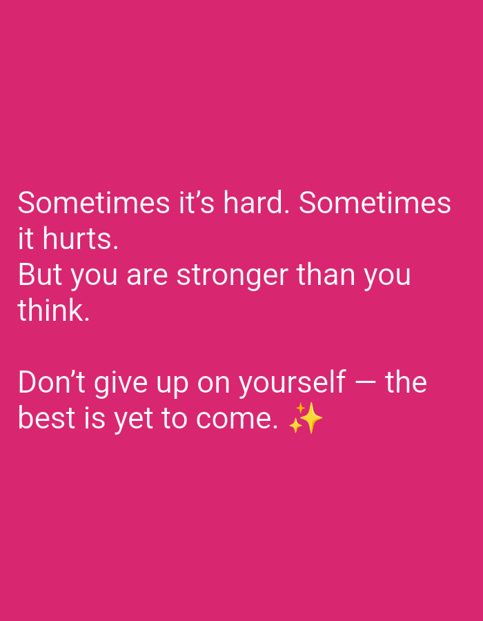 The image displays a solid, dark pink or magenta background. Centered white text is present in a sans-serif typeface. The text reads: "Sometimes it's hard. Sometimes it hurts. But you are stronger than you think. Don't give up on yourself — the best is yet to come." Following the last sentence, two yellow four-point star emojis are present. The scene contains no discernible people, physical subjects, objects, actions, interactions, or environmental features. There is no visual information within the image to indicate a specific geographic location, including any part of Gabrovo, Bulgaria.