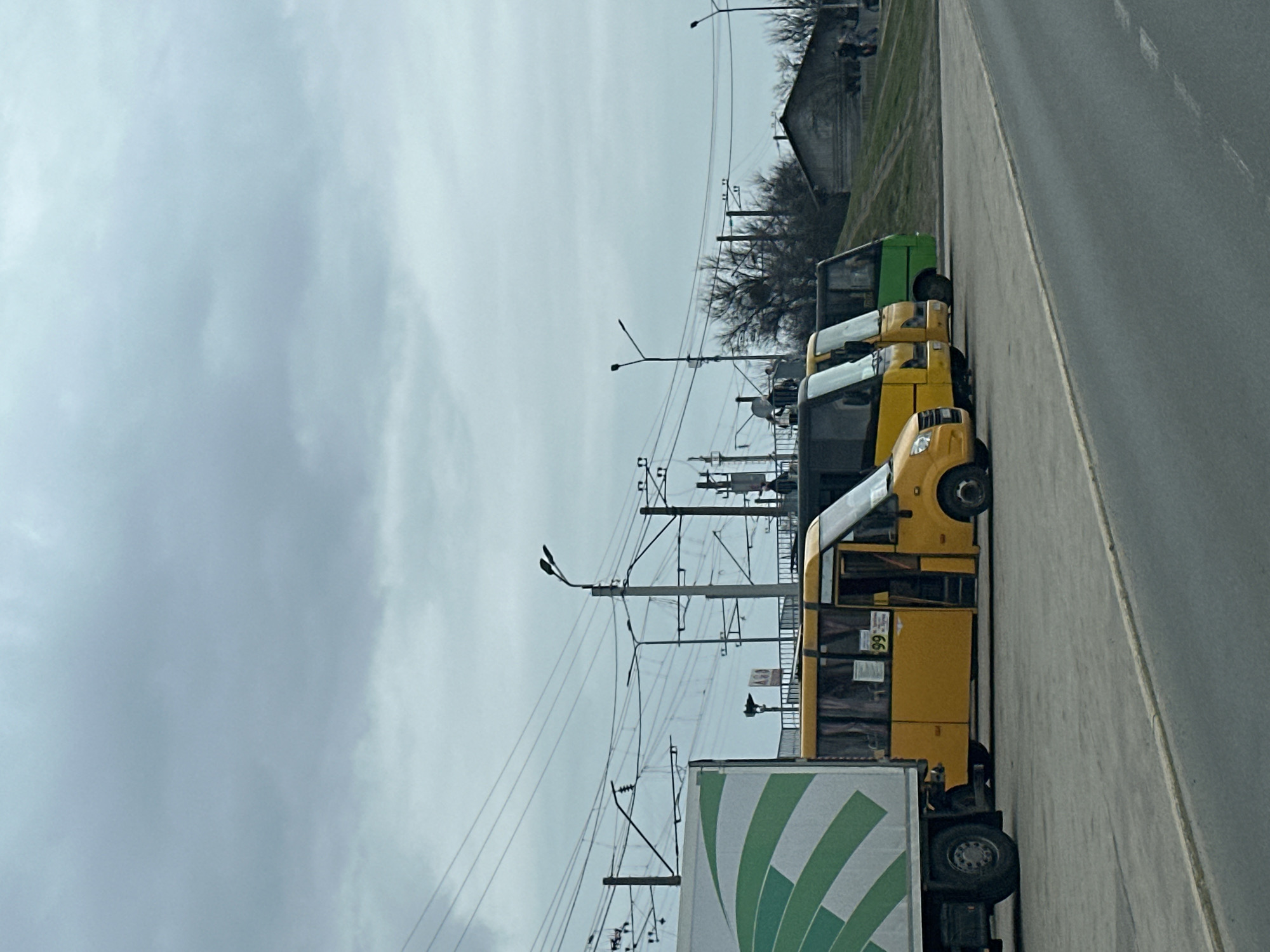 This image depicts a roadside scene in Irpin, Ukraine, under an overcast, light grey sky. In the foreground, an asphalt road runs along the right side, bordered by a concrete curb separating it from a lighter-colored paved parking area. From left to right, a sequence of vehicles is parked on this paved area: The rear section of a white semi-trailer truck, partially visible on the far left, features green diagonal stripes. Next to it, a yellow minibus, consistent with a Gazelle-based "marshrutka," is parked with its side passenger door open. A white sign with the number "99" in black text is visible through its window. Immediately behind the first yellow minibus, a second yellow minibus is partially visible, followed by a green minibus further back and to the right, all parked in a line. The mid-ground is dominated by a complex network of overhead power lines and numerous utility poles supporting streetlights. A metal bridge or overpass structure runs horizontally across the mid-ground, featuring metal railings and additional support poles. One individual in dark clothing is discernible on this bridge structure, positioned near the railings. In the background, to the right, a grassy embankment slopes upward, sparsely covered with bare trees or bushes. A single-story, dark-colored wooden building with a sl sloped roof stands on this embankment. Several indistinct figures appear to be present on the grassy slope near the building. The overall lighting is diffused, consistent with an overcast day.