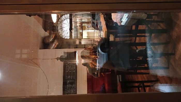 The image provides a forensic view captured through a glass window from an exterior vantage point, depicting the interior of a restaurant or bar in Vienna, Austria, superimposed with reflections of the street scene outside