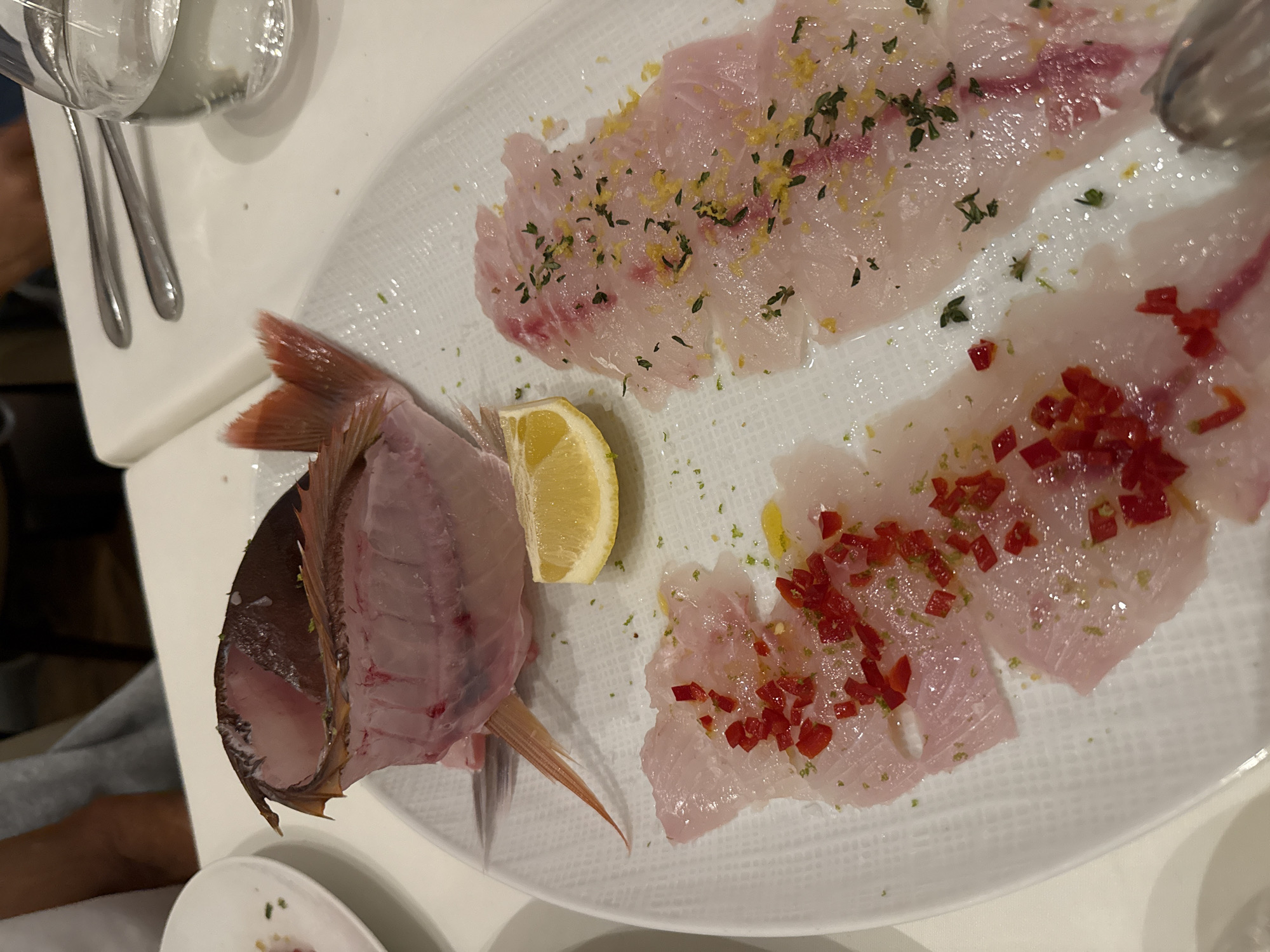 A white rectangular plate displays a deconstructed raw fish dish within a dining establishment in Athens, Greece