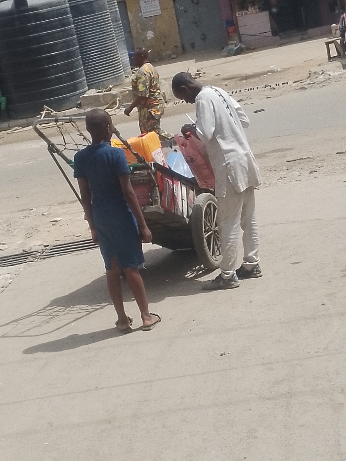 The scene depicts a street in Sabon Gari West, Nigeria, under bright daylight. In the foreground, a child, viewed from behind, stands facing slightly right, wearing a dark blue short-sleeved dress and light-colored flip-flops. To their right, an adult male stands next to a two-wheeled metal handcart, facing partially away from the viewer, clad in a light-colored long tunic with a patterned back and light trousers, paired with dark sneakers. He appears to be interacting with or examining items on the cart, holding a white object in his right hand. The handcart is loaded with multiple plastic jerrycans, including a prominent yellow one on the left and a large pink one on the right, alongside other assorted containers. In the mid-ground, a third individual, dressed in a patterned long-sleeved top and matching lower garment, walks away from the viewer. The background features a collection of large, black, ribbed plastic water storage tanks on the left. Further right, buildings with modest facades are visible, one displaying a partially legible sign including the word "MAKER" and a phone number (08030248811). The ground is a light-colored paved surface, with some scattered debris and a metal drain grate visible on the left. Shadows indicate strong overhead sunlight.