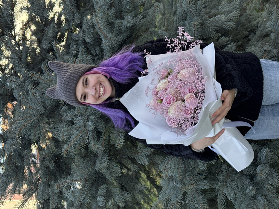 A female subject is depicted outdoors in the City of Zagreb, Croatia, standing centered against a dense blue-green conifer tree. The subject, a young adult with long, visible purple hair, wears a dark grey knitted beanie with pointed ear-like protrusions, a black zippered fleece jacket, and light blue jeans. She is smiling broadly, exposing her teeth, and looks directly towards the viewer. Both hands hold a large bouquet wrapped in white paper, secured with a white ribbon. The bouquet consists predominantly of light pink roses and light pink ruffled flowers, interspersed with delicate pink, fern-like filler foliage. A blurred, light-colored building facade is visible in the upper right background. The scene is illuminated by natural daylight.