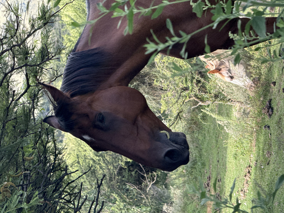 - "A close-up shot displays a brown horse with a dark mane grazing amidst greenery and sparse trees" by FM-E55pJ3, licensed under CC BY 4.0