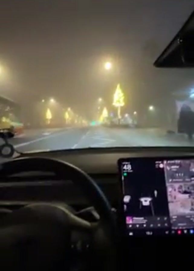 view from the driver's seat of a car, presumably a Tesla, driving down a foggy street at night
