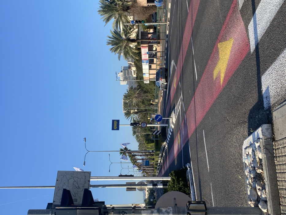 The image captures a sunlit urban street scene in Kiryat Motzkin, Israel, under a clear blue sky